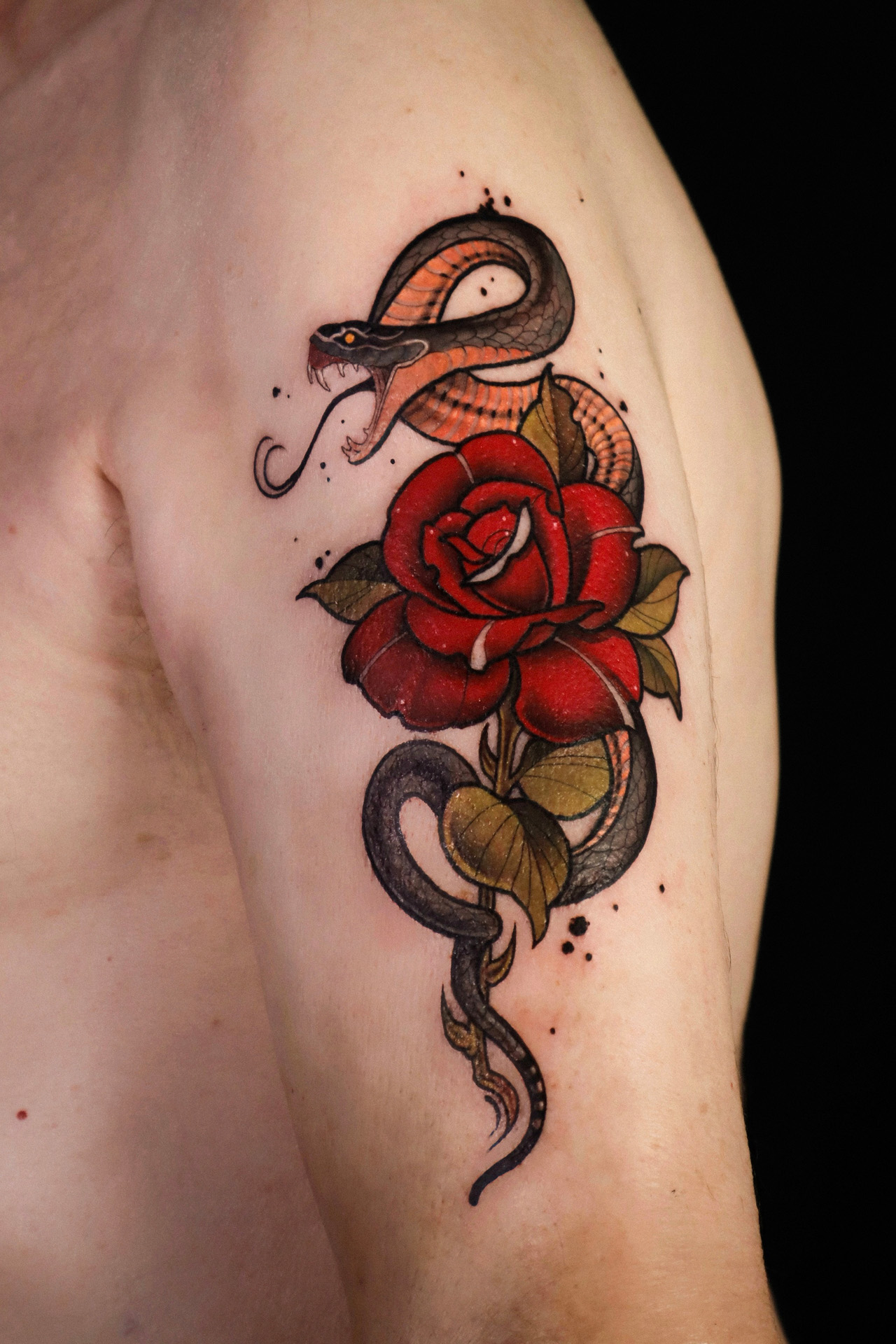 El neotradicional combina la fuerza del tatuaje clásico con una estética más moderna y detallada. Colores intensos, líneas definidas y composiciones cuidadas que permiten reinterpretar el arte tradicional con un enfoque contemporáneo y expresivo.