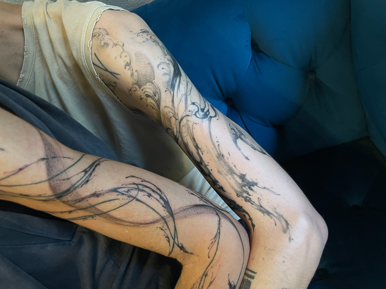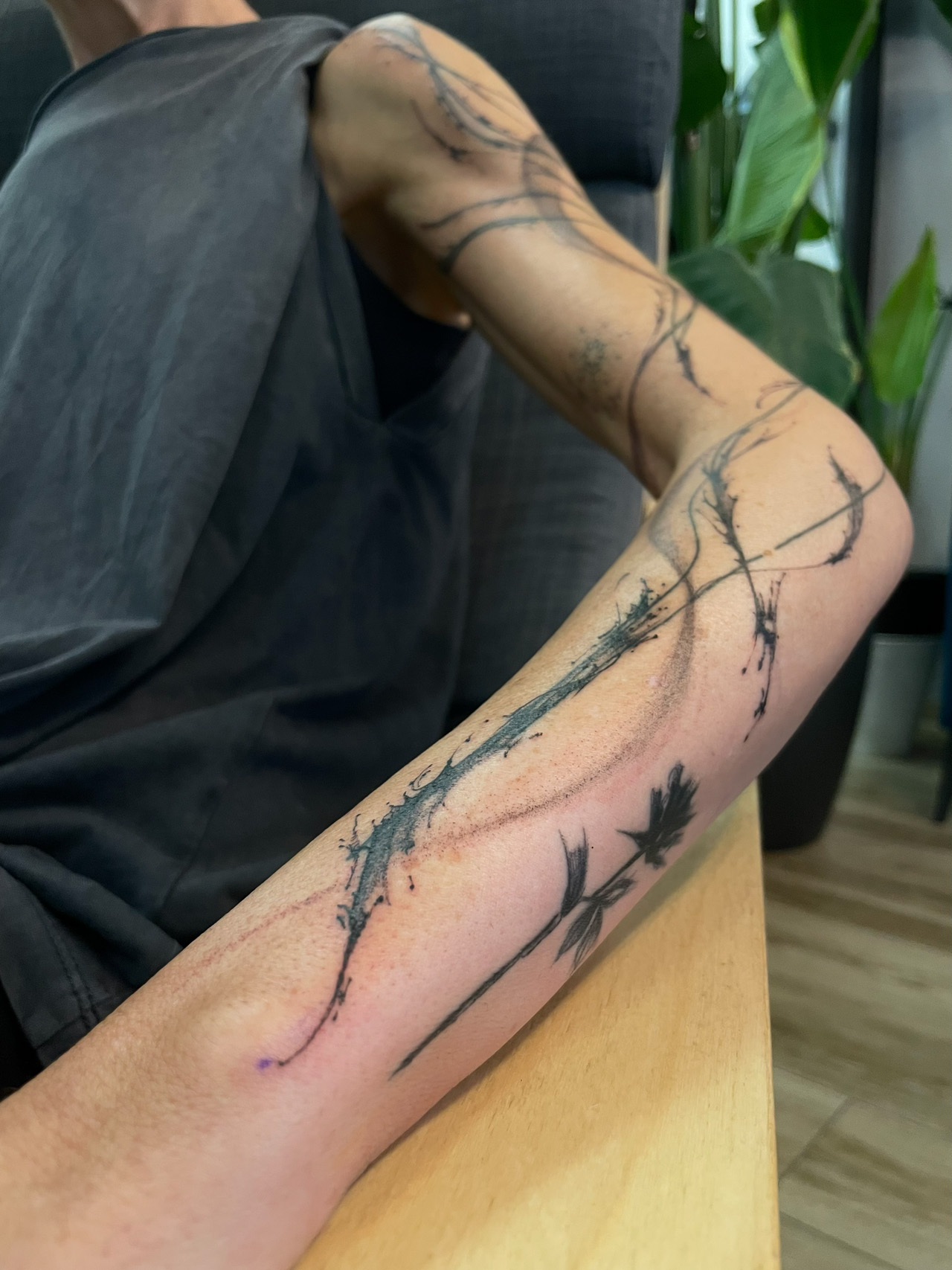Aproveché el movimiento que ya tenía su tatuaje anterior para integrarlo y darle nueva vida. El resultado fue fresco, dinámico y completamente suyo. Inma estaba feliz. Me dijo que ya podía mirarse el brazo cada día con orgullo, y eso es lo que más me llena.